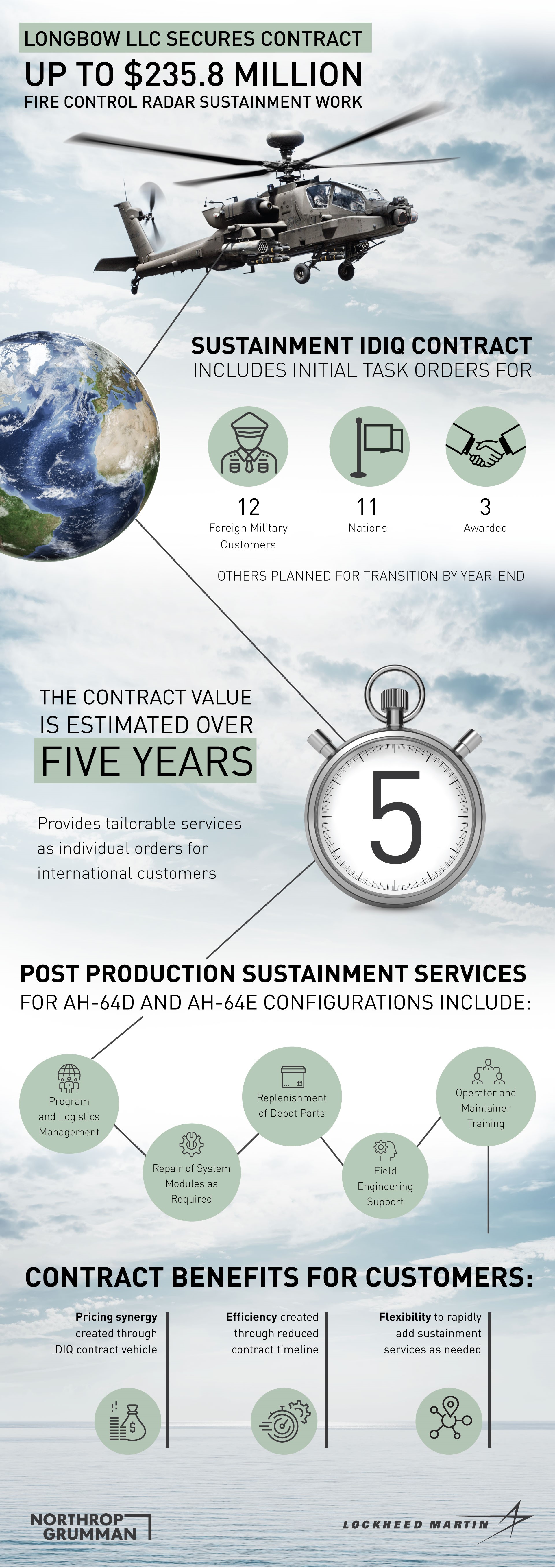 The LONGBOW Fire Control Radar (FCR) system is built by a Joint Venture of Lockheed Martin and Northrop Grumman for the Apache attack helicopter. As a force multiplier that has been battle-proven in Operation Enduring Freedom and Operation Iraqi Freedom, the LONGBOW FCR system provides Apache aircrews with automatic target detection, location, classification and prioritization, while enabling rapid, multi-target engagement in all weather conditions over multiple types of terrain and through battlefield obscurants. The LONGBOW FCR system has been in full-rate production since 1996, with the first unit equipped in 1998. To date, 500 LONGBOW FCR systems have been delivered to the U.S. Army and international customers.