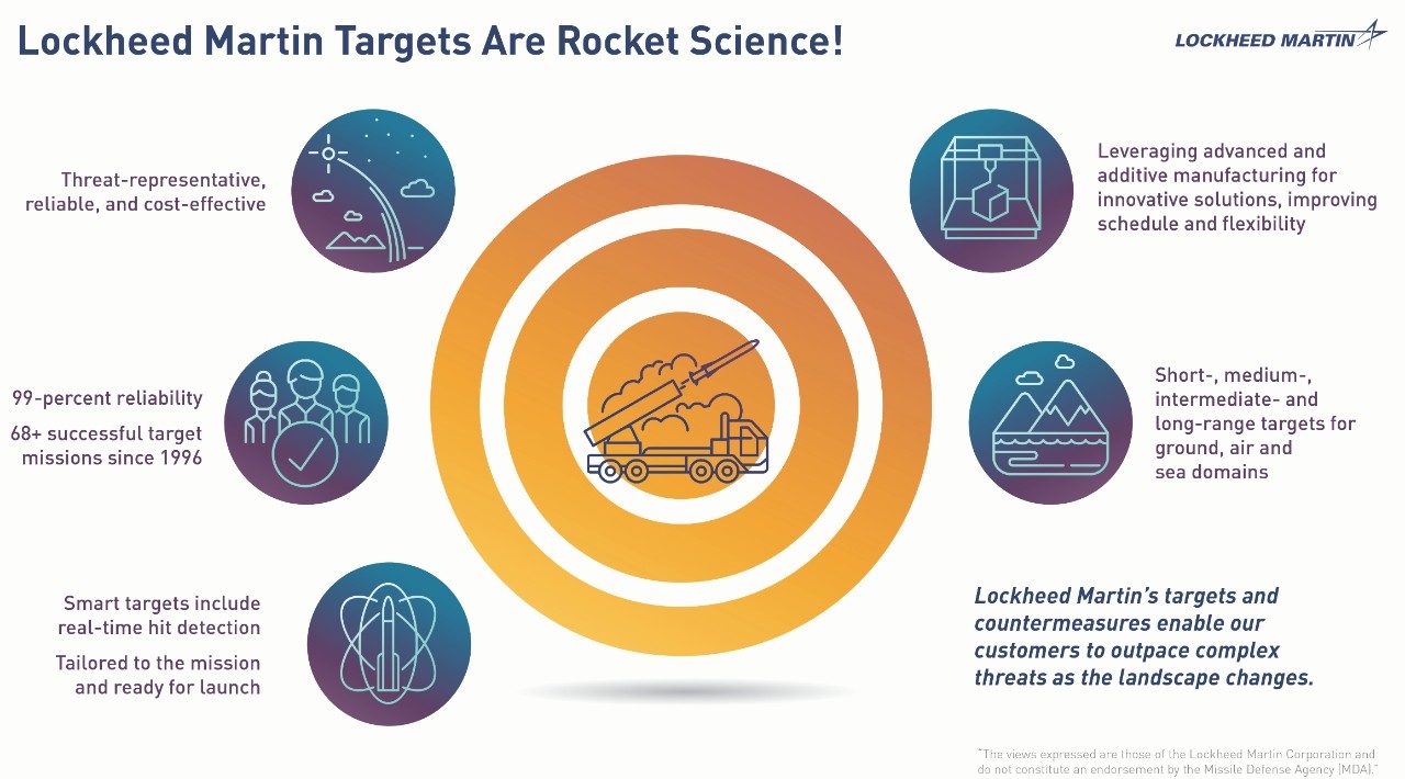 Lockheed Martin Target solutions enable a robust test regime that stresses the architecture, system design, and performance of the Missile Defense System. This includes tests against known and emerging threats in realistic, operational-like scenarios.